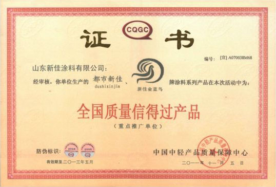 新佳涂料榮獲全國質量信得過產品稱號