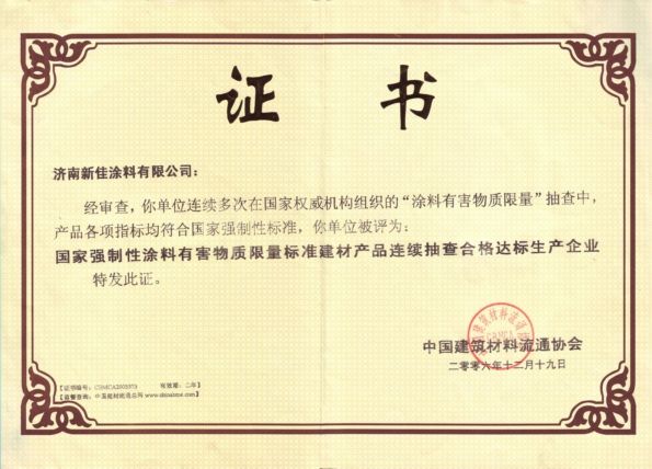 新佳涂料榮獲無毒害綠色建材稱號