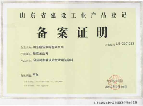 山東省建設工業品備案證 真石漆系列